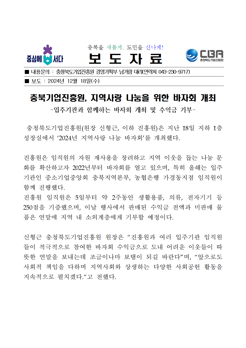| 다음글 | 충북기업진흥원, 지역사랑 나눔 바자회 수익금 기부 |
