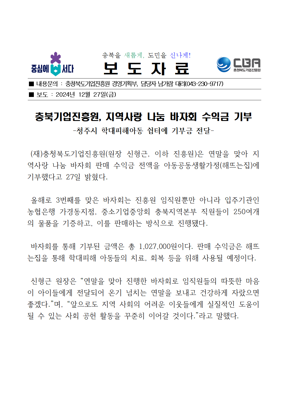 | 충북기업진흥원, 지역사랑 나눔 바자회 수익금 기부 | |||||