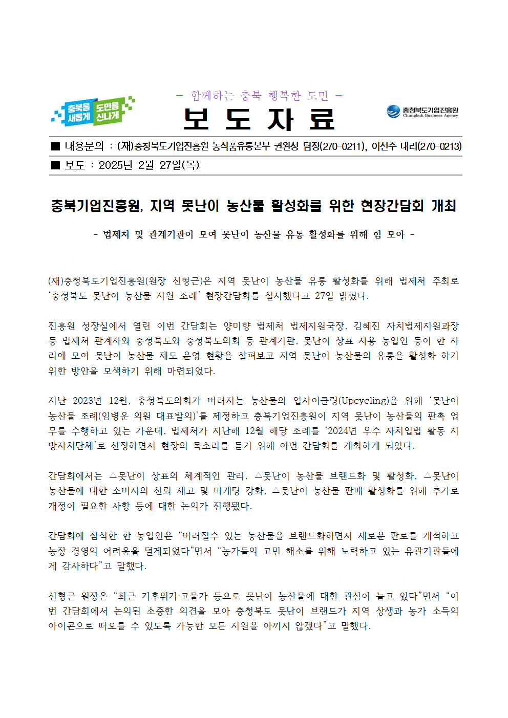 | 충북기업진흥원, 지역 못난이 농산물 활성화를 위한 현장간담회 개최 | |||||