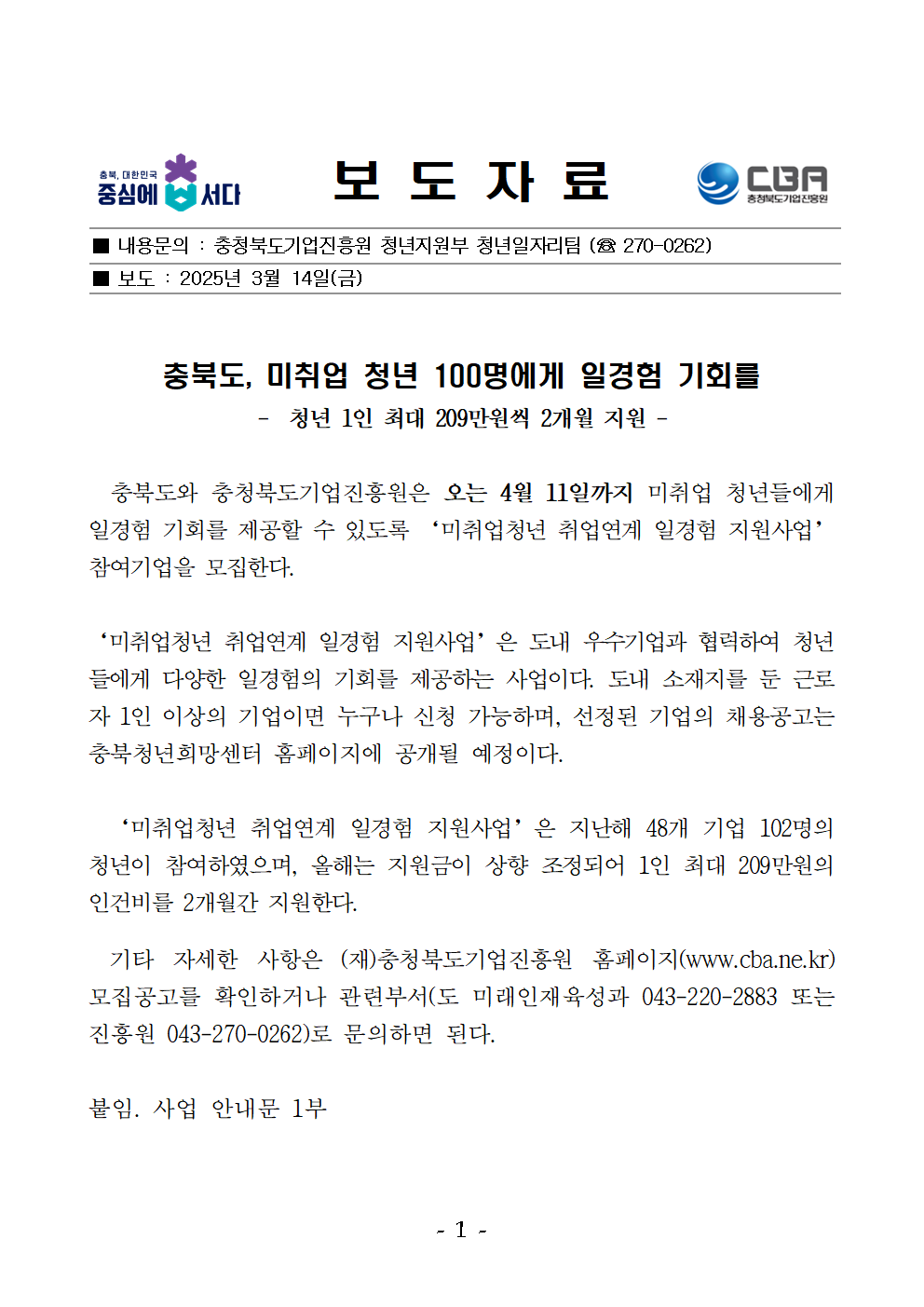 "충북기업진흥원, 청년 일경험 지원사업 참여기업 모집"- CJB 청주방송(2025.03.14)
