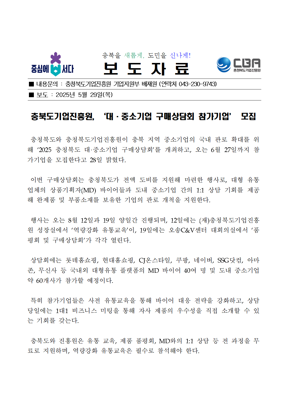 | 충북기업진흥원, 충북 ‘대·중소기업 구매상담회 참가기업’ 모집 | |||||