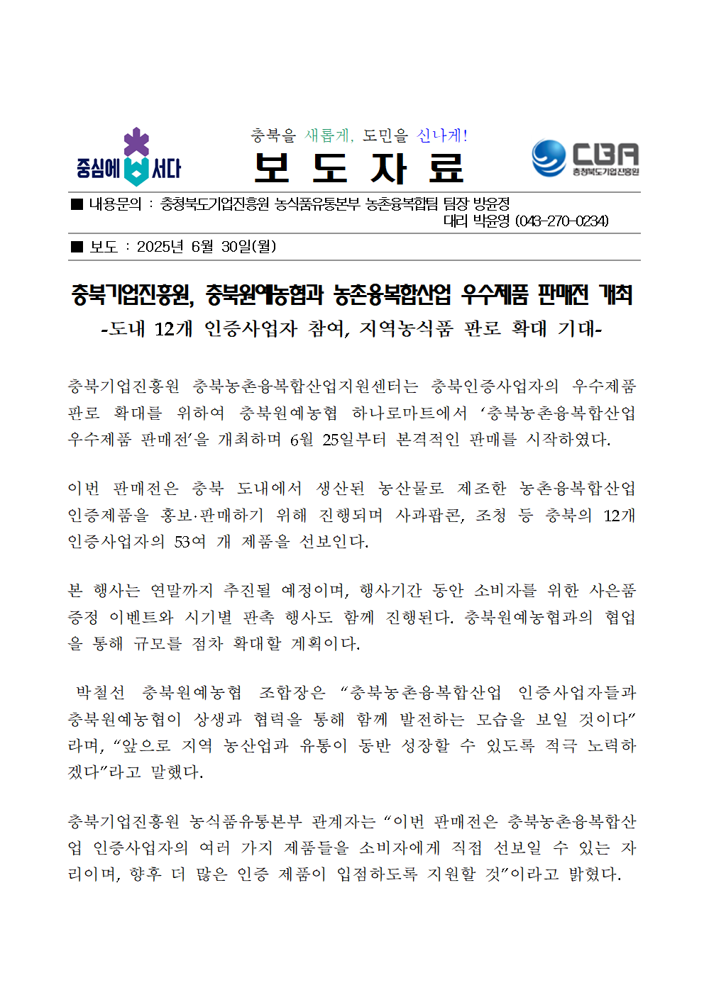 | 충북기업진흥원, 충북원예농협과 농촌융복합산업 우수제품 판매전 개최 | |||||
