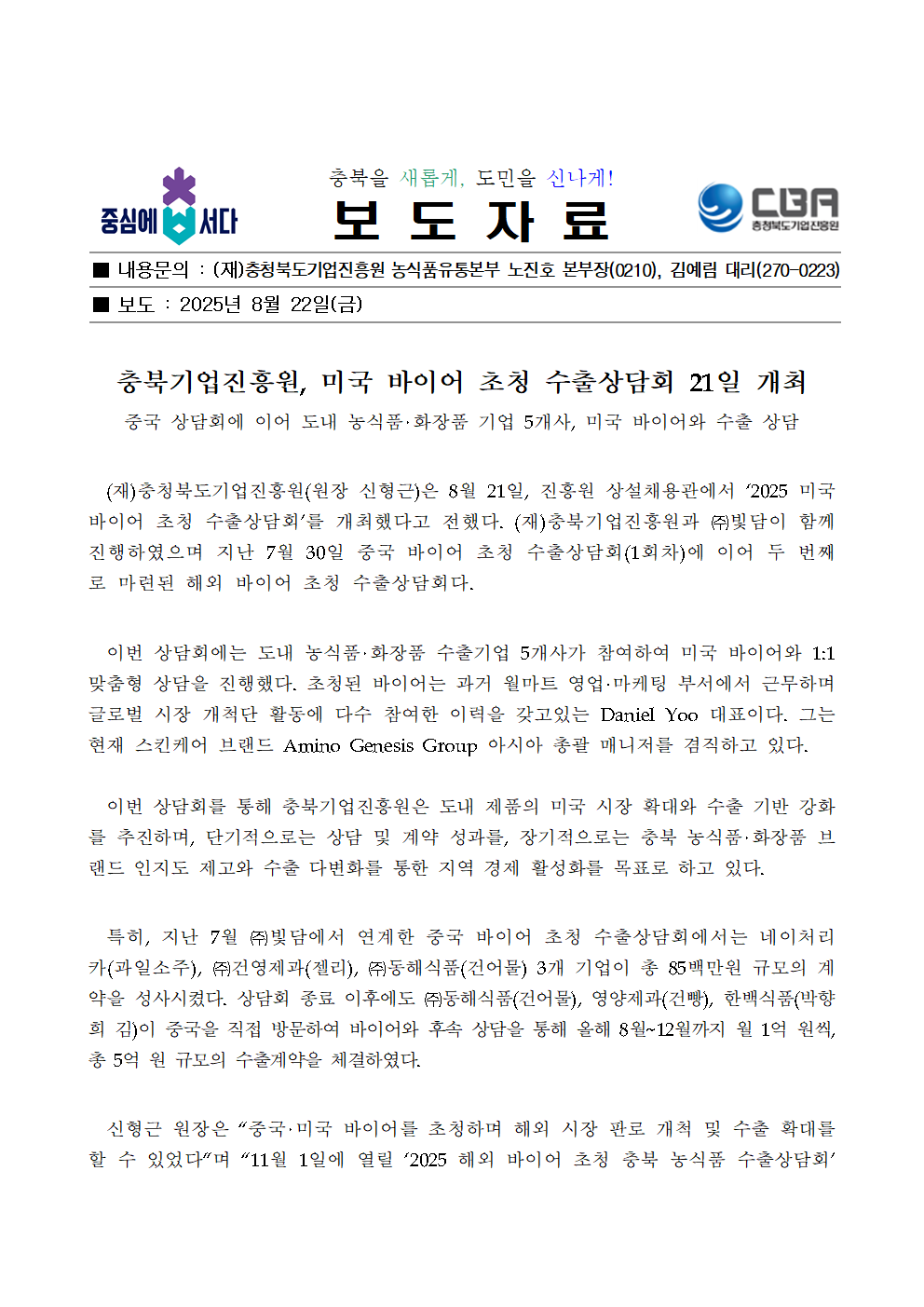 | 충북기업진흥원, 미국 바이어 초청 수출상담회 21일 개최 | |||||