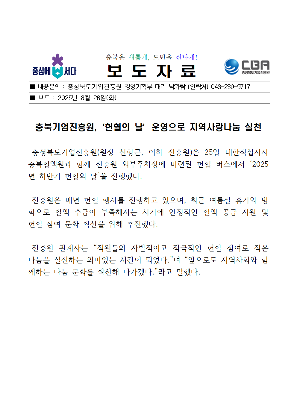 | 충북기업진흥원, ‘헌혈의 날’ 운영으로 지역사랑나눔 실천 | |||||