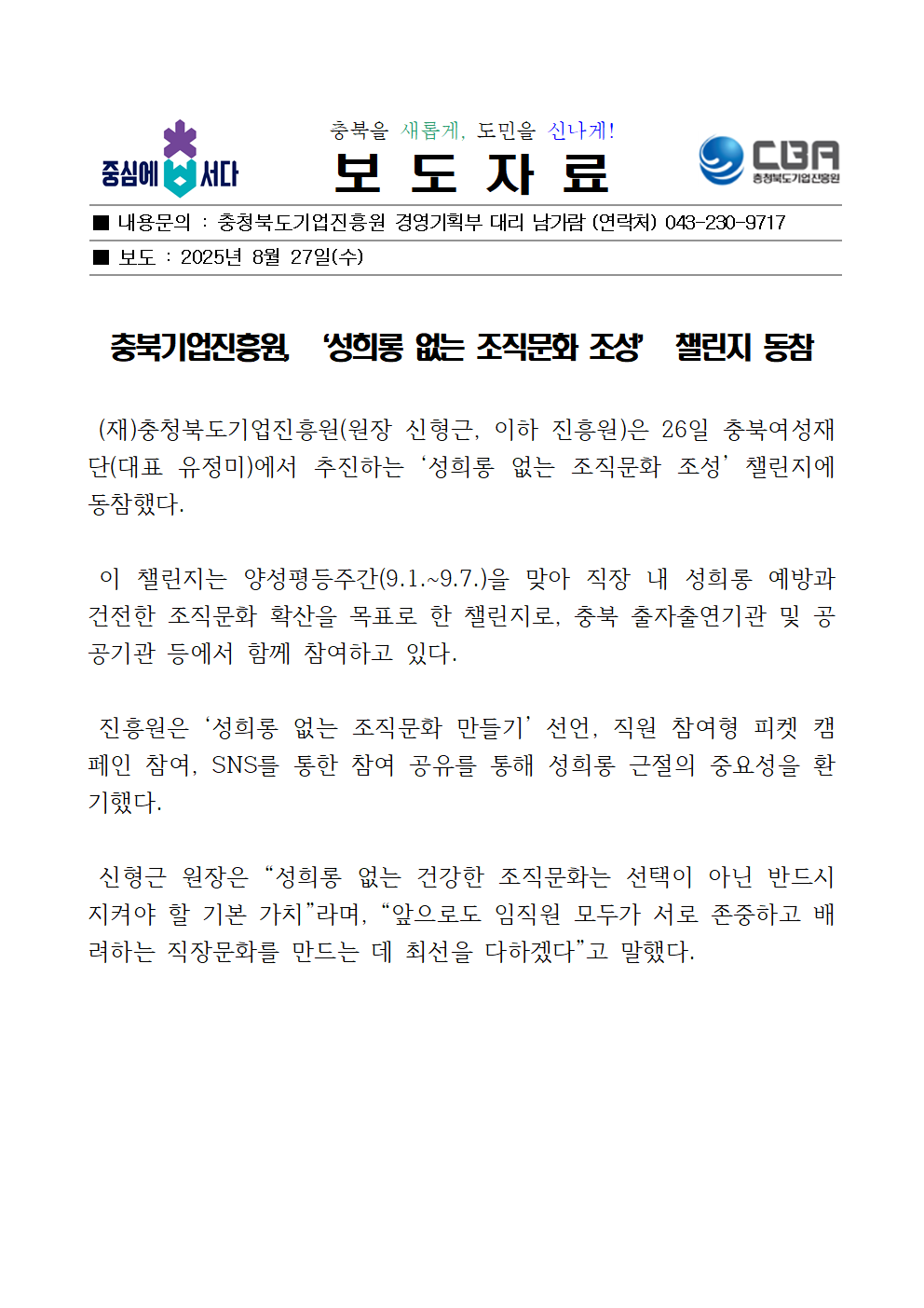 | 충북기업진흥원, ‘성희롱 없는 조직문화 조성’ 챌린지 동참 | |||||