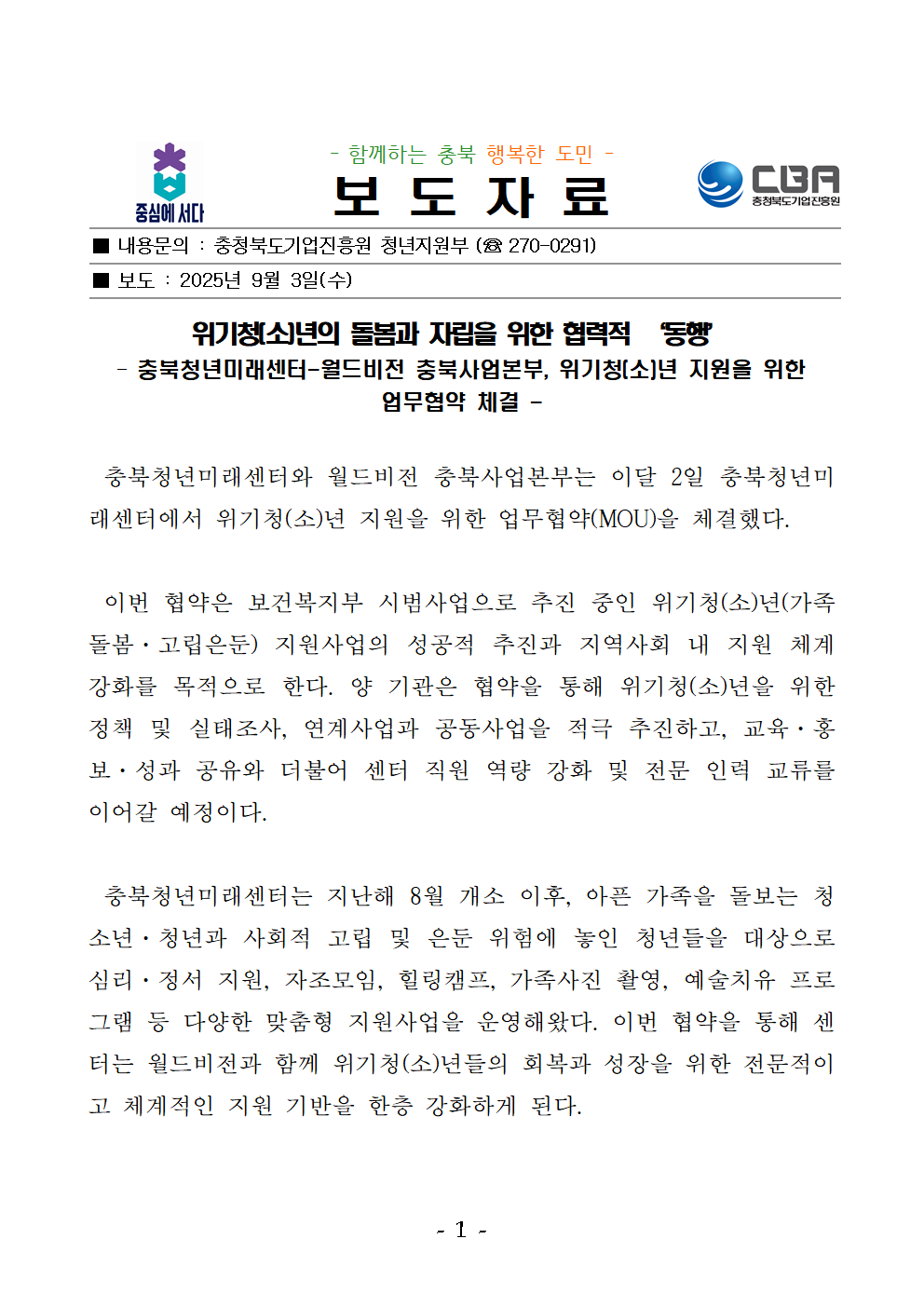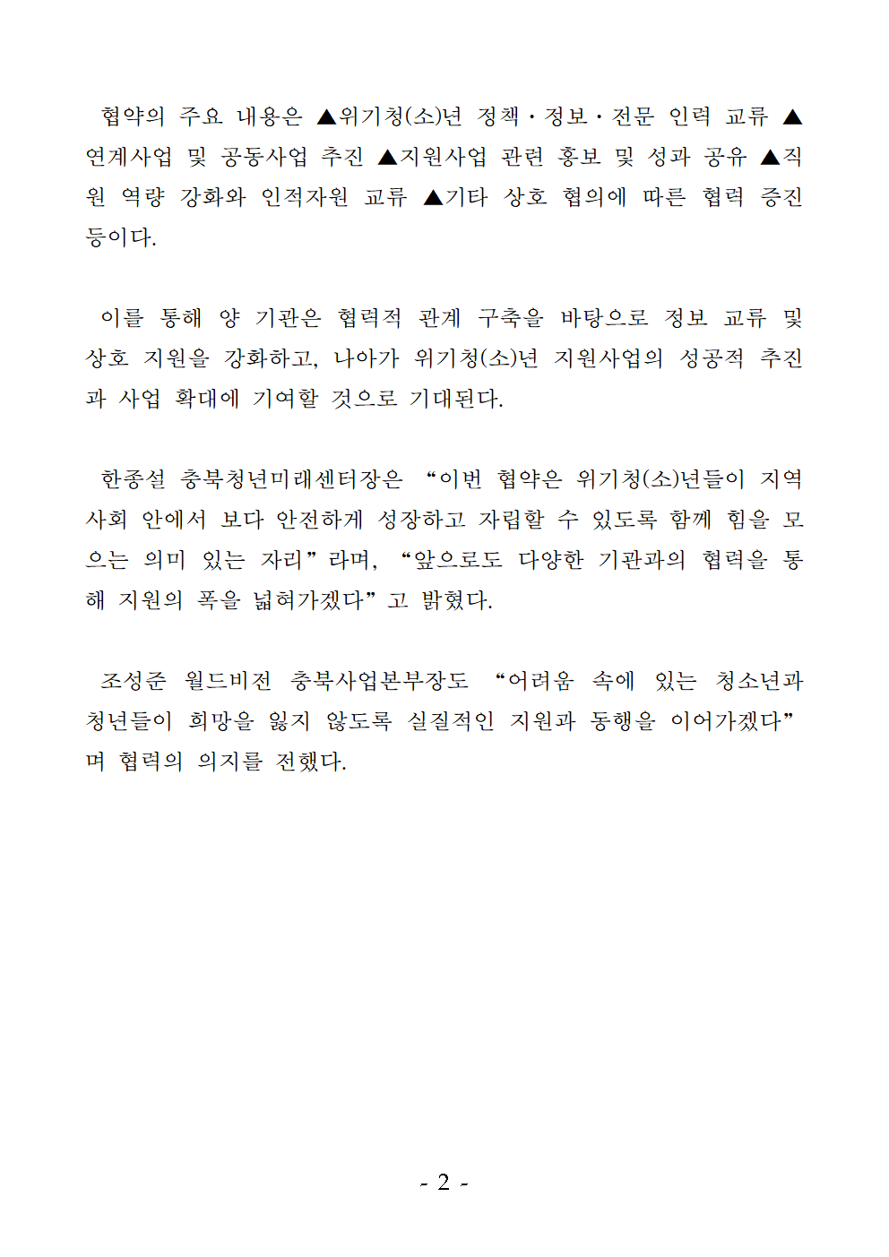 | 충북청년미래센터-월드비전 충북사업본부, 위기청(소)년 지원을 위한 업무협약 체결 | |||||