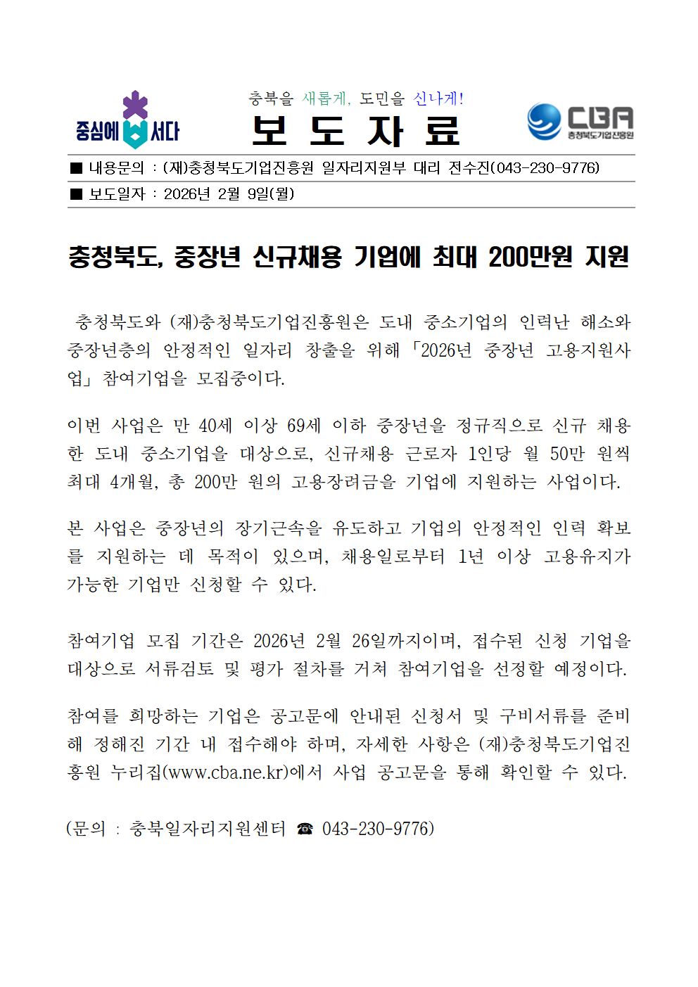| 충청북도, 중장년 신규채용 기업에 최대 200만원 지원 |