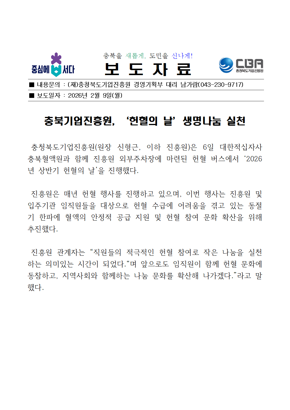 | 충북기업진흥원, ‘헌혈의 날’생명나눔 실천 |