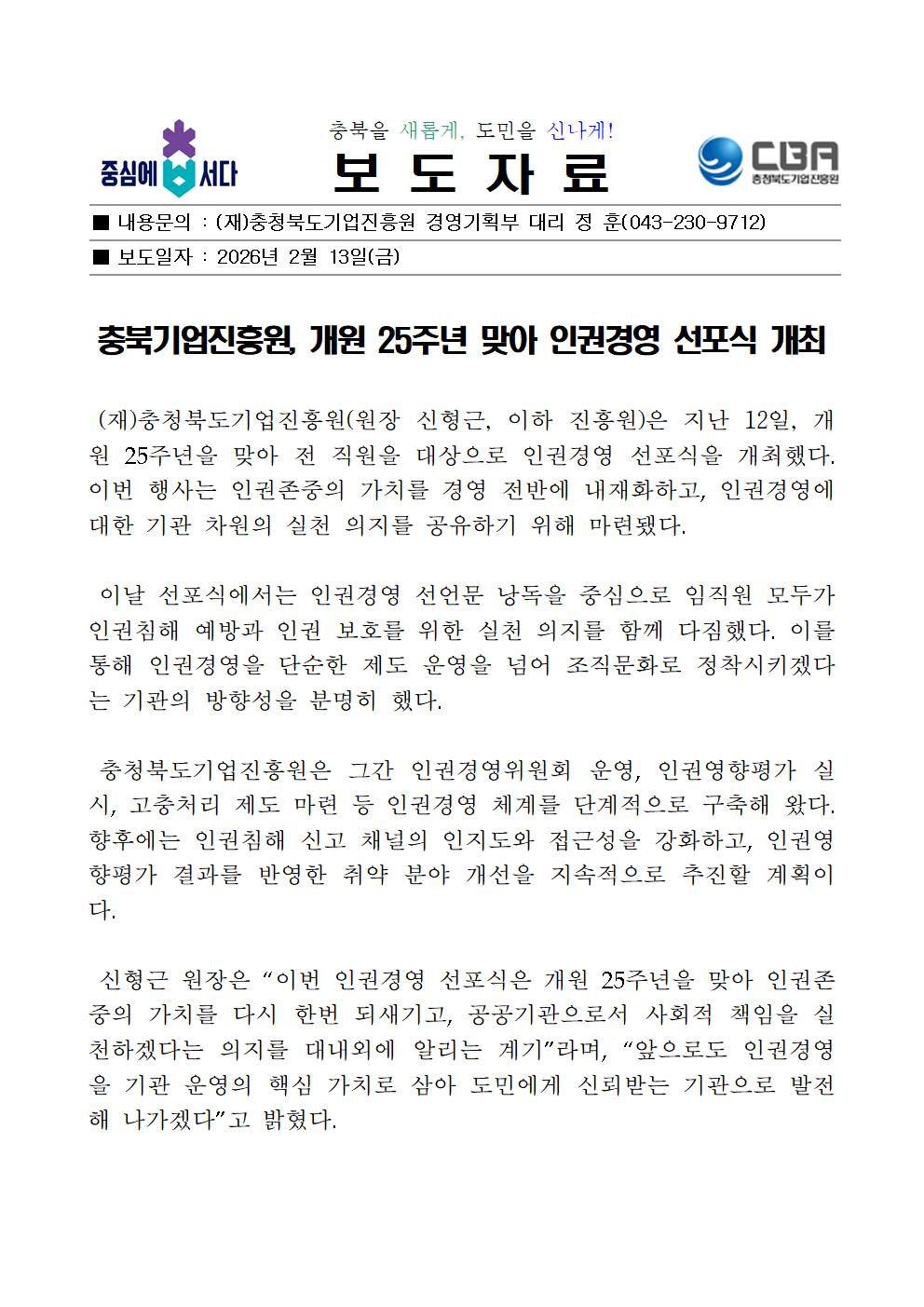충북기업진흥원, 개원 25주년 맞아 인권경영 선포식 개최