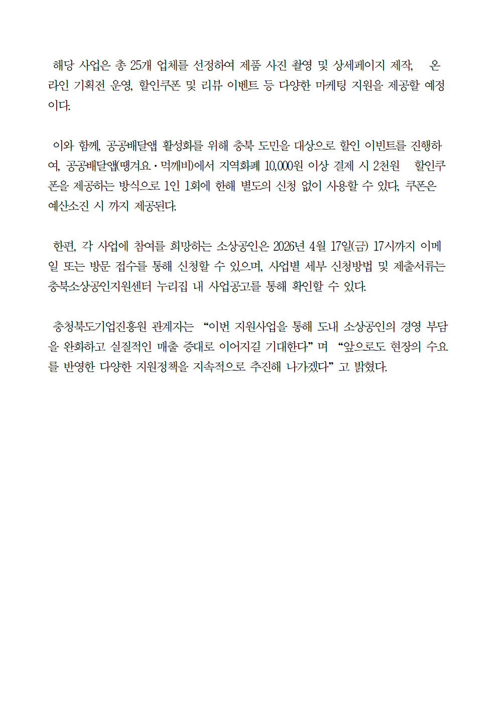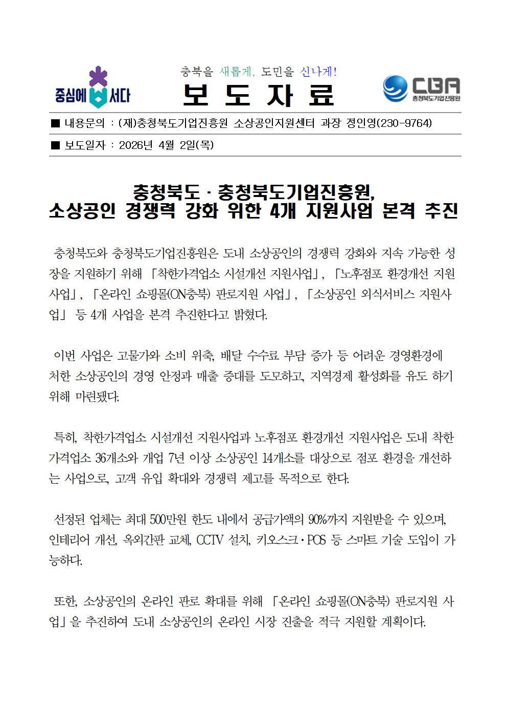 | 충청북도·충청북도기업진흥원, 소상공인 경쟁력 강화 위한 4개 지원사업 본격 추진 |