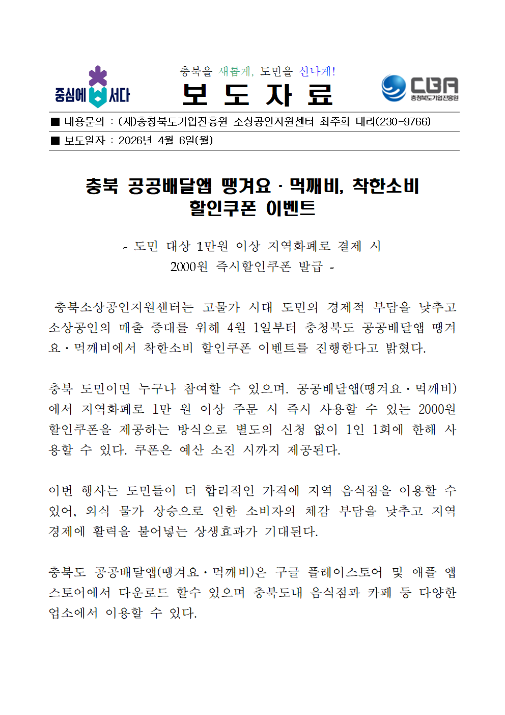 | 충북 공공배달앱 땡겨요·먹깨비, 착한소비 할인쿠폰 이벤트 |