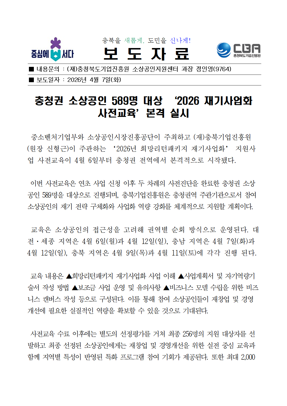 | 충청권 소상공인 589명 대상 ‘2026 재기사업화 사전교육’ 본격 실시 |
