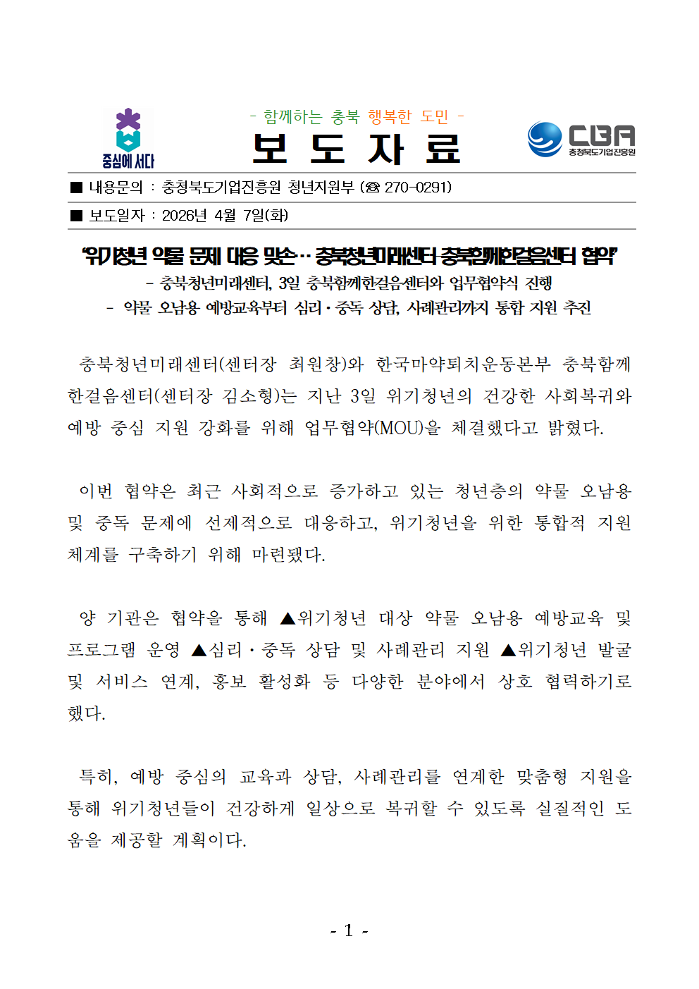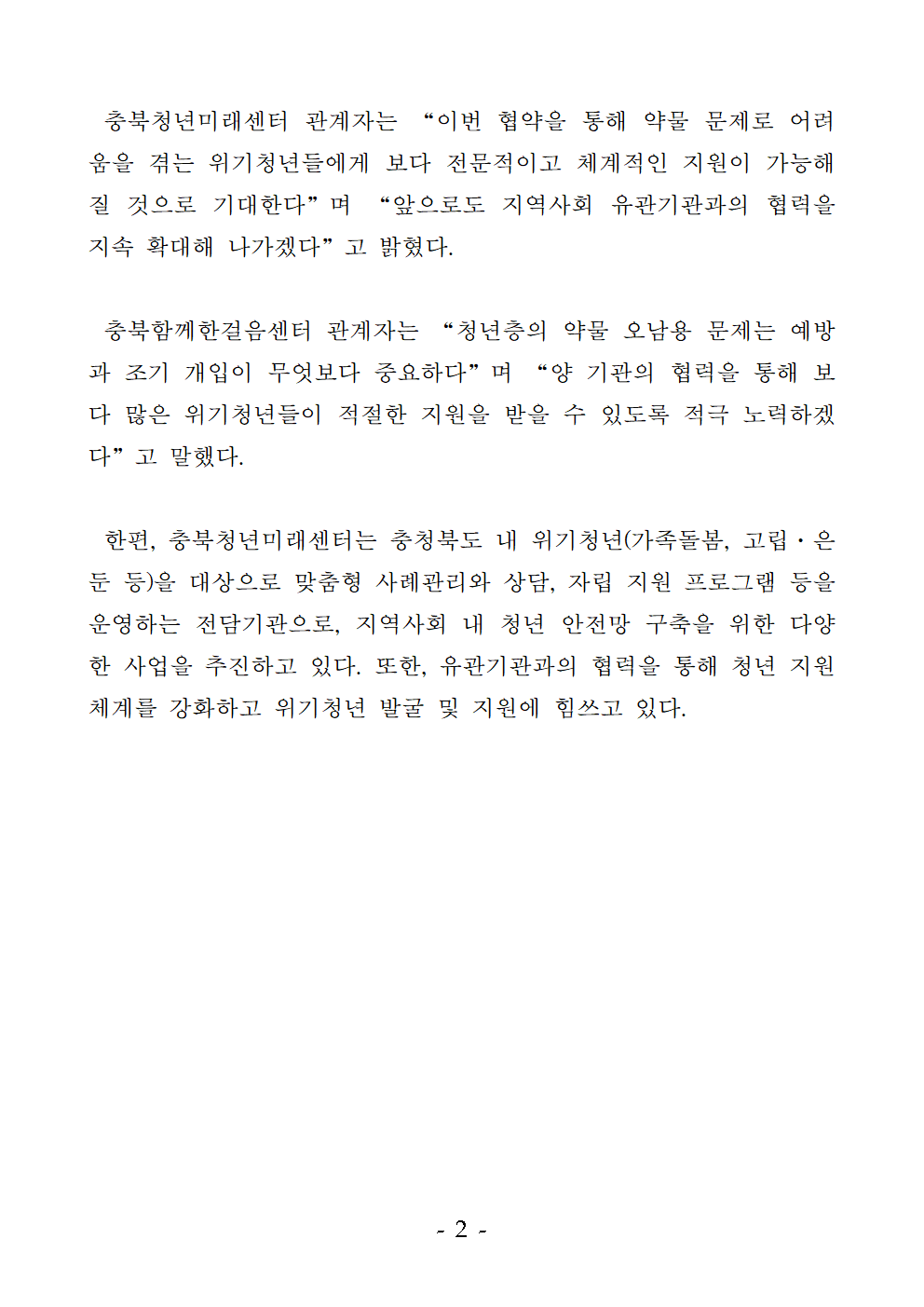 | “위기청년 약물 문제 대응 맞손… 충북청년미래센터–충북함께한걸음센터 협약” |