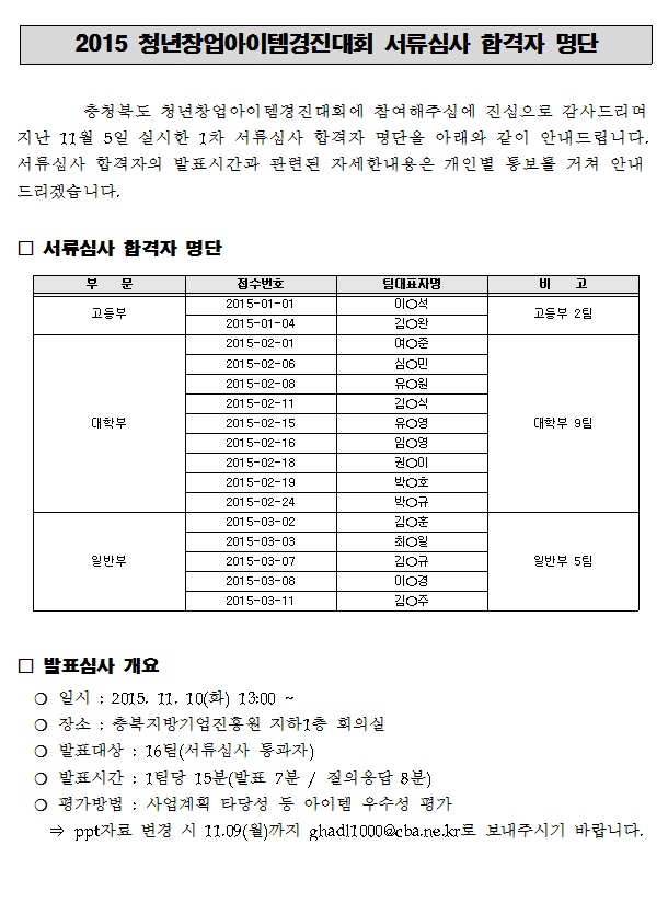| [공고]2015 충청북도 청년창업아이템경진대회 서류통과자 공지 | |||||
