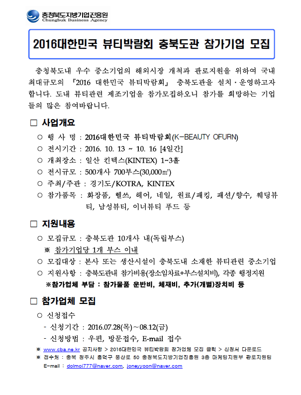 2016대한민국 뷰티박람회 충북도관 참가기업 모집