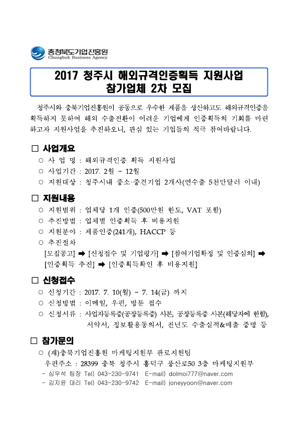| 2017 청주시 해외규격인증획득 지원사업 참가업체 2차 모집 | |||||