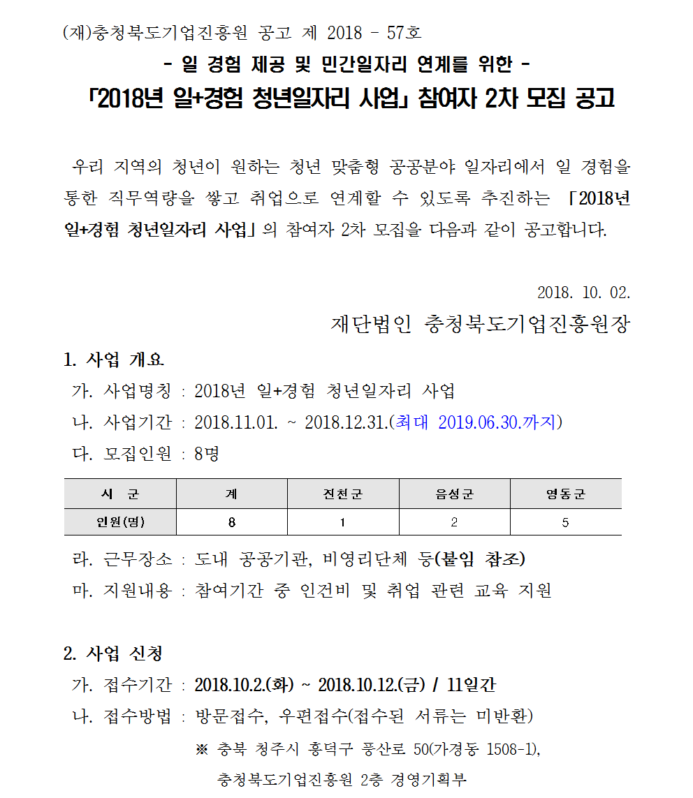 | 2018년 일+경험 청년일자리사업 참여자 2차 모집 공고 | |||||