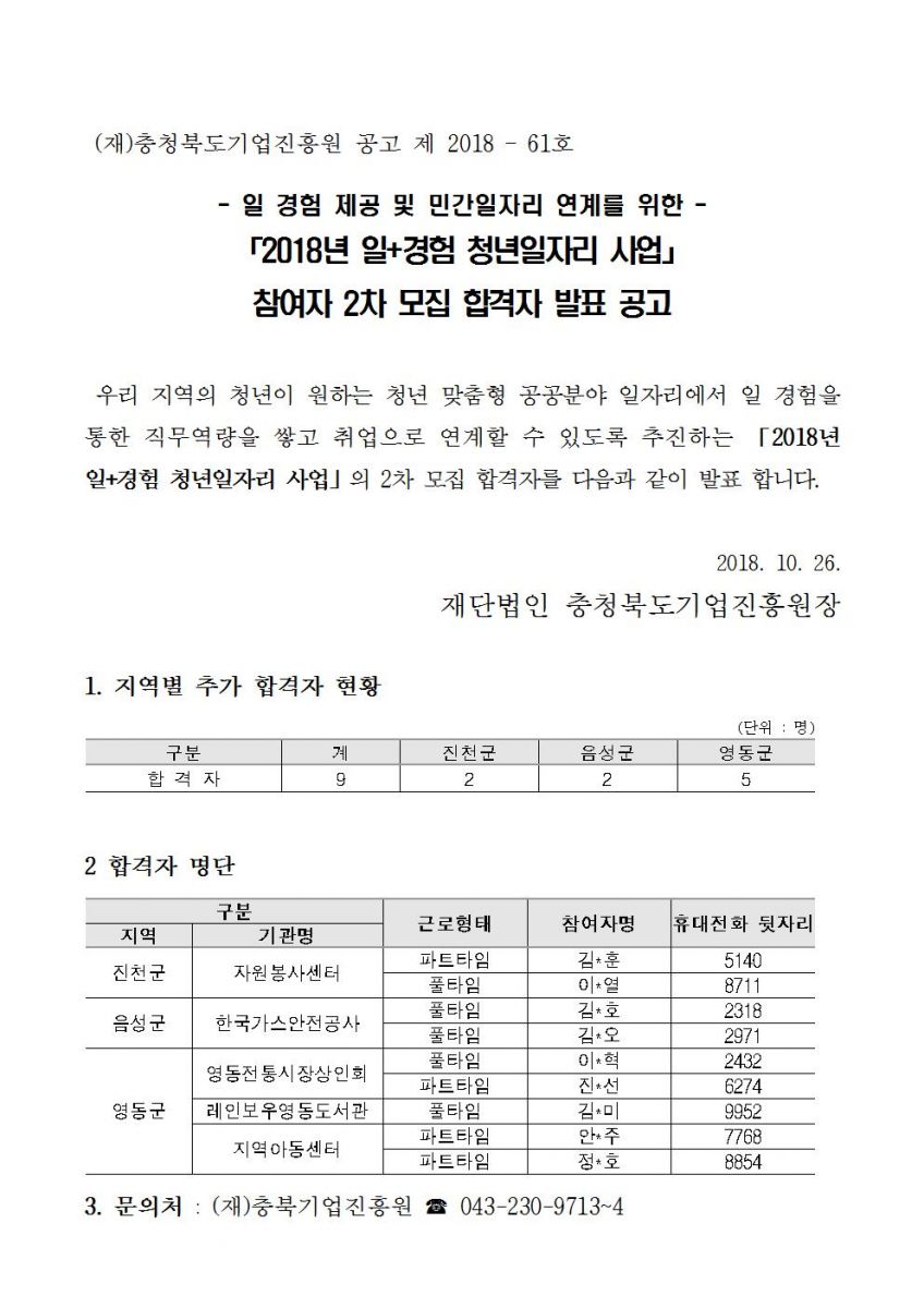 | 2018년 일+경험 청년일자리사업 참여자 2차 모집 합격자 발표 | |||||