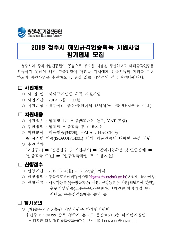 | 2019 청주시 해외규격인증획득 지원사업 참가업체 모집 | |||||