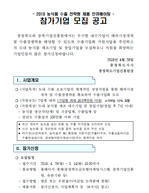 2019 농식품 수출 전략형 제품 인큐베이팅 지원사업 참가업체 모집