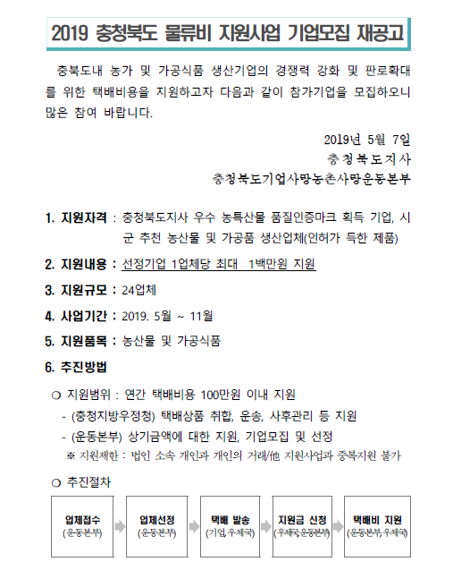 | 2019 충청북도 물류비 지원사업 기업 모집 재공고 | |||||