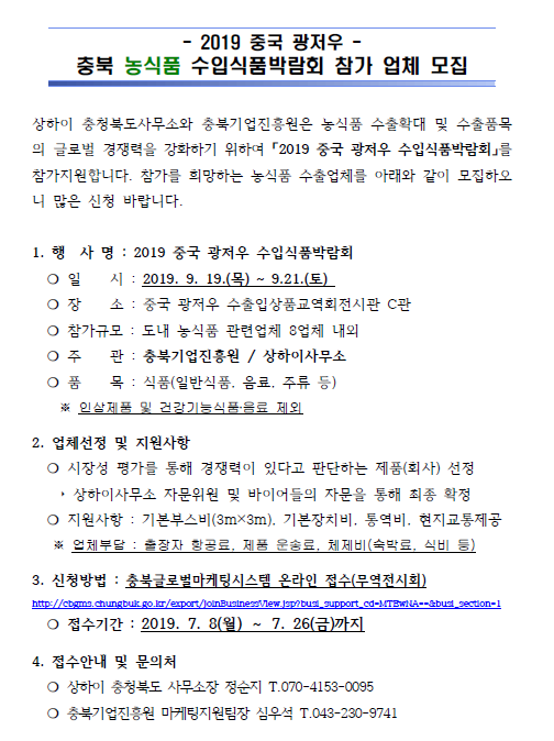 | 다음글 | 2019 해외 바이어초청 충북 농식품 수출상담회 참가업체 모집 |