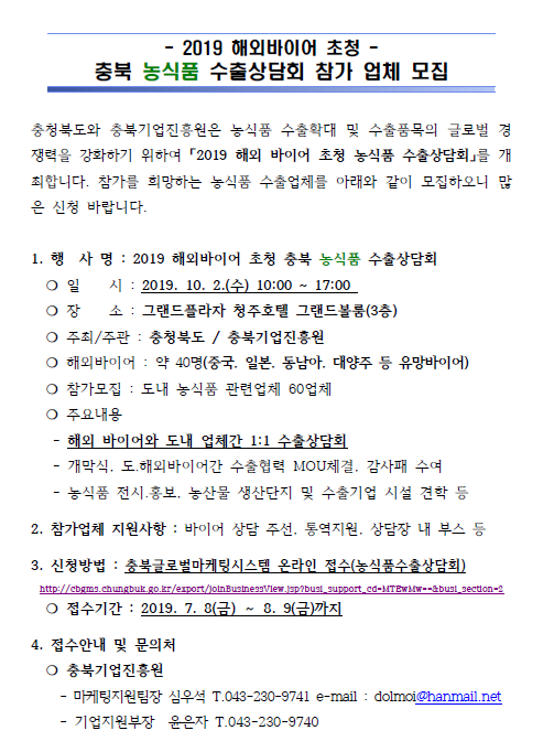| 2019 해외 바이어초청 충북 농식품 수출상담회 참가업체 모집 | |||||