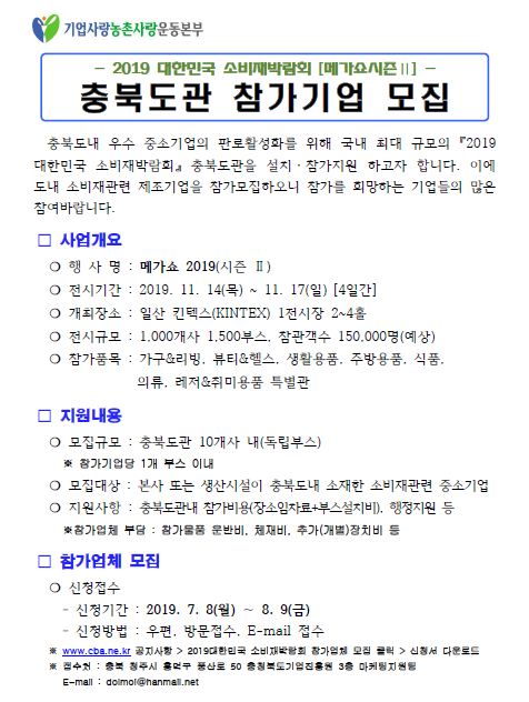 | 2019 대한민국 소비재박람회[메가쇼 시즌2] 충북도관 참가기업 모집 | |||||