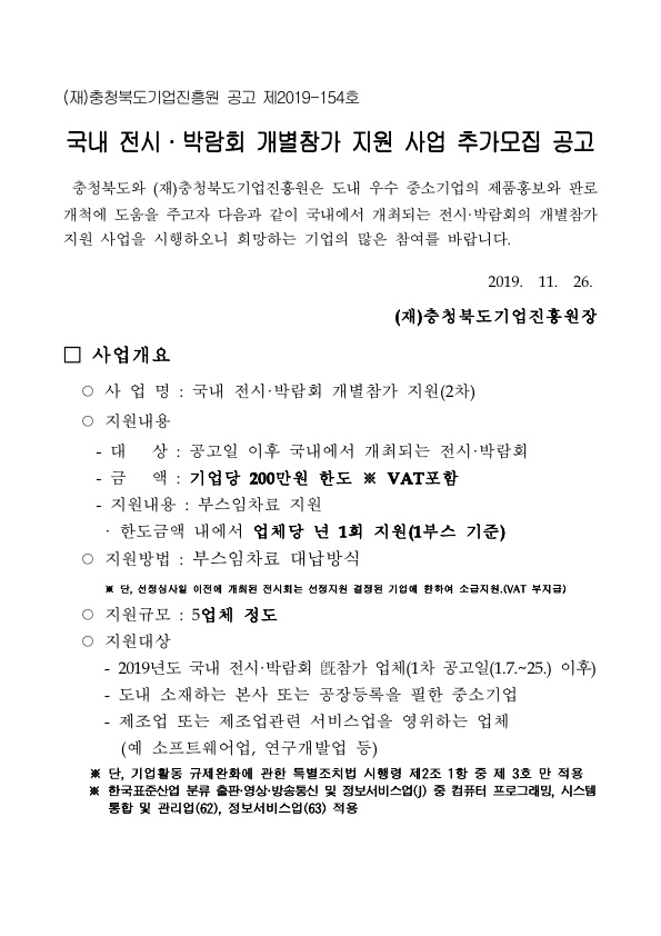 | 2019 국내전시박람회 개별참가지원사업 추가모집 공고 | |||||