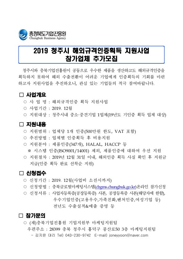 | 2019 청주시 해외규격인증획득 지원사업 참가업체 추가모집 | |||||