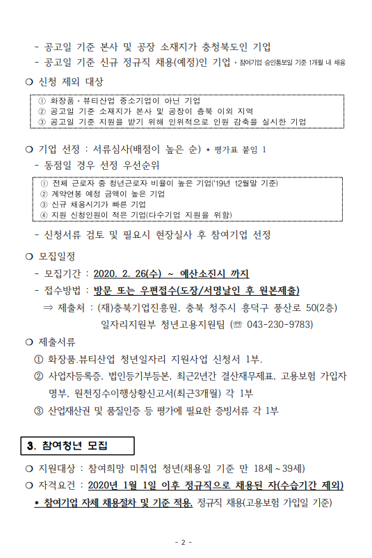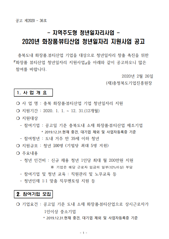 | 2020 화장품뷰티산업 청년일자리 지원사업 재공고 | |||||