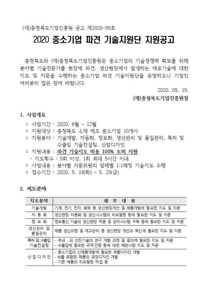 | 2020 중소기업 파견 기술지원단 지원공고 | |||||