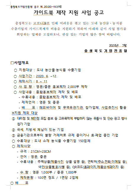 | 충북 수출 농식품 가이드북 제작 사업 업체모집 공고 | |||||