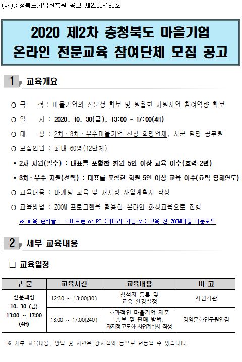 | 2020 제2차 충북마을기업 온라인 전문교육 참여단체 모집 | |||||