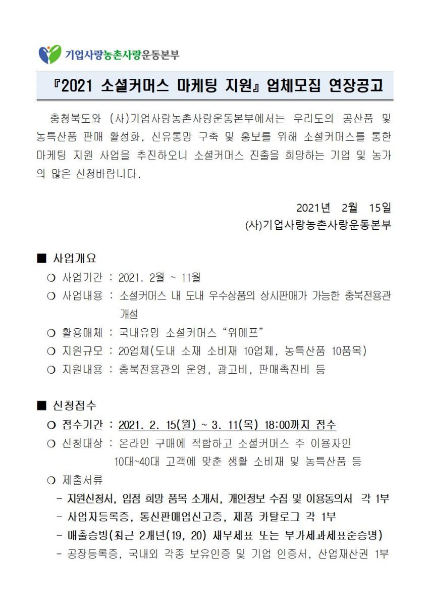 | 2021 소셜커머스를 통한 마케팅지원 업체모집 안내 (연장공고) | |||||