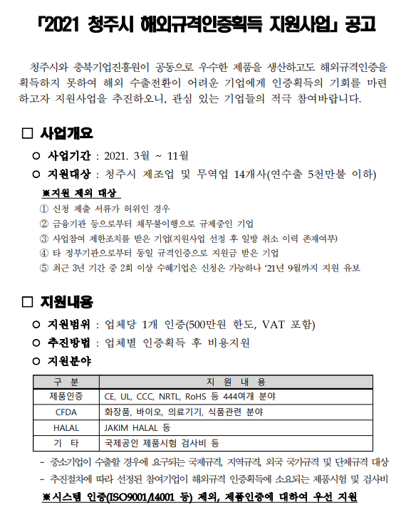 | 2021 청주시 해외규격인증 획득 지원사업 공고 | |||||