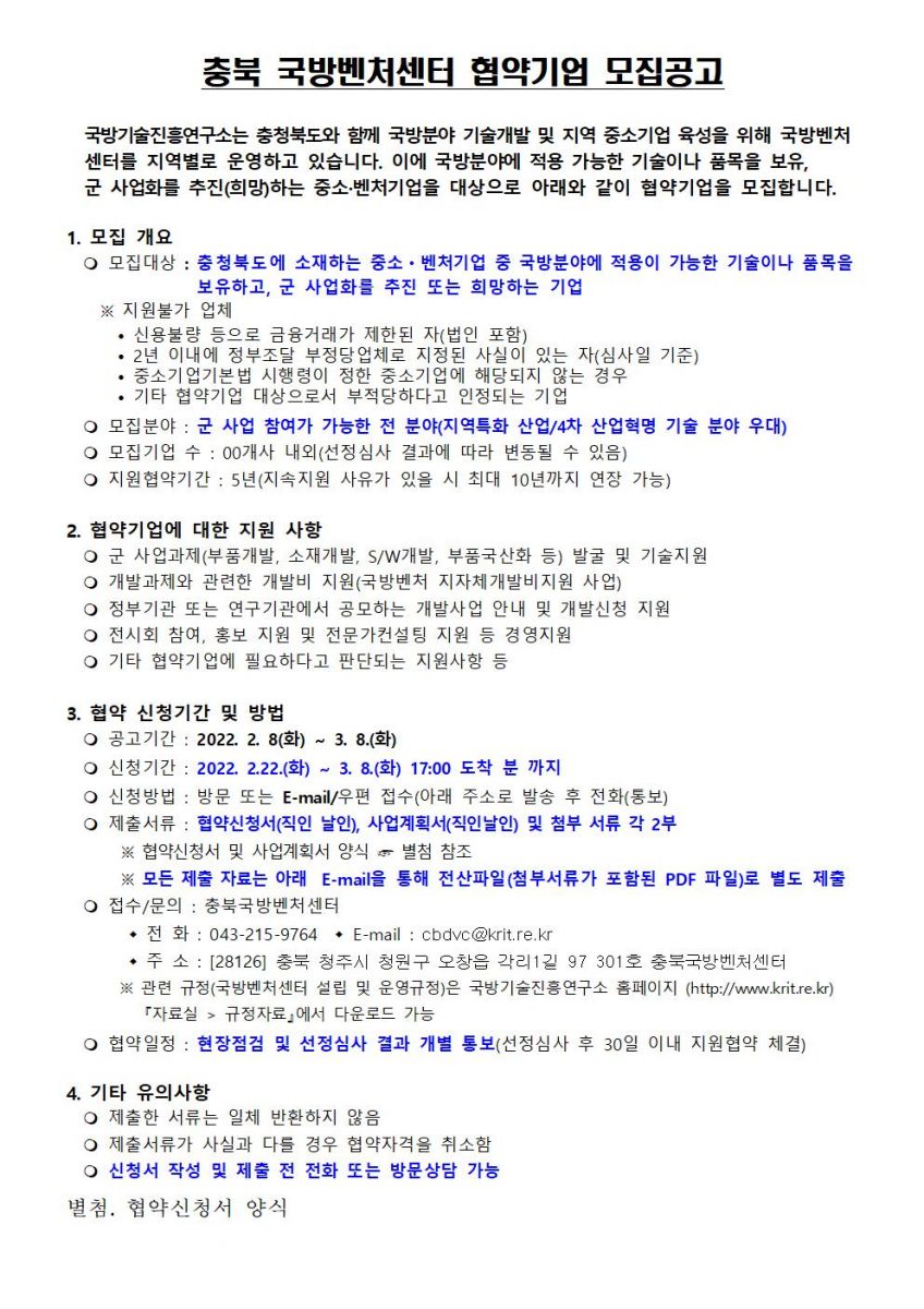 국방기술진흥연구소에서 충북지역 국방산업 활성화를 위해 국방사업에 참여를 희망하는 충북도 소재 유망 중소·벤처기업을 붙임과 같이 모집하고있습니다. 많은 관심과 참여 부탁드립니다.