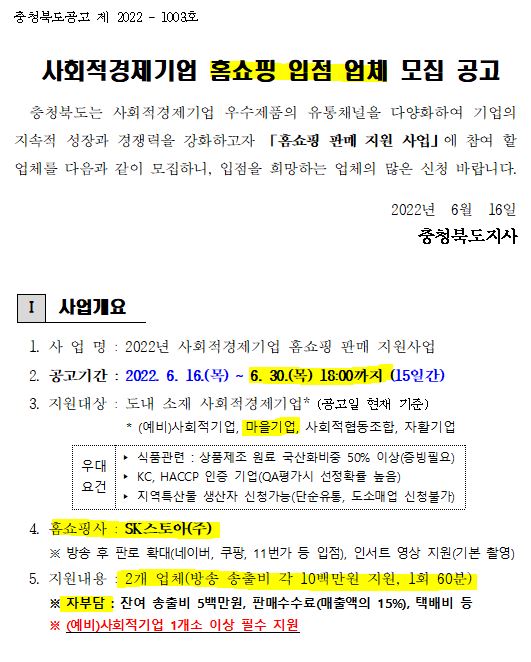 충청북도에서 사회적경제기업을 대상으로 홈쇼핑(SK스토아) 판매 지원사업을 모집 공고하고 있습니다.