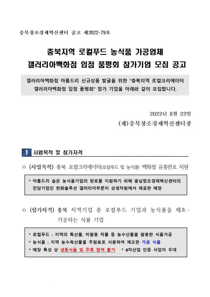 | 충북 로컬푸드·농식품가공업체 갤러리아 백화점 입점 품평회 모집 공고 | |||||
