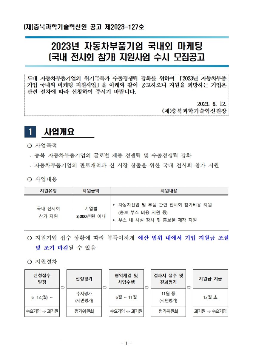 | 2023년 자동차부품기업 국내외 마케팅(국내 전시회 참가) 지원사업 모집 공고 | |||||
