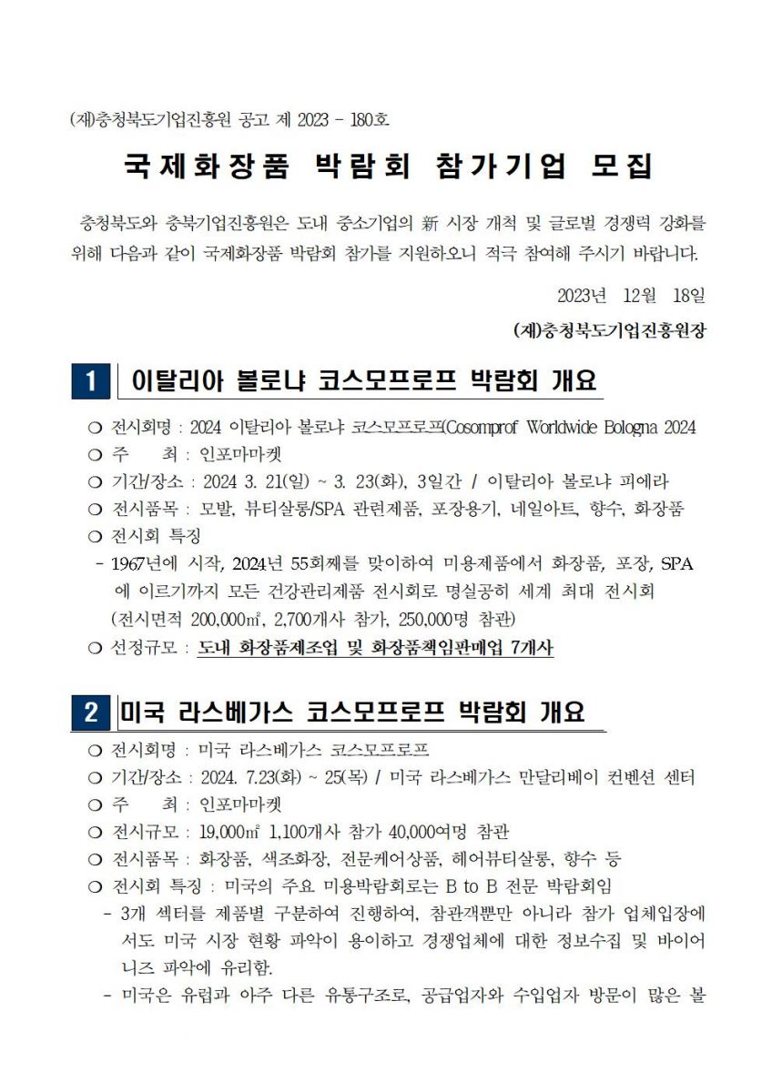 | 2024 국제화장품박람회 참가지원 참여기업 모집공고(이탈리아 볼로냐 코스모프로프, 미국 라스베가스 코스모프로프) | |||||