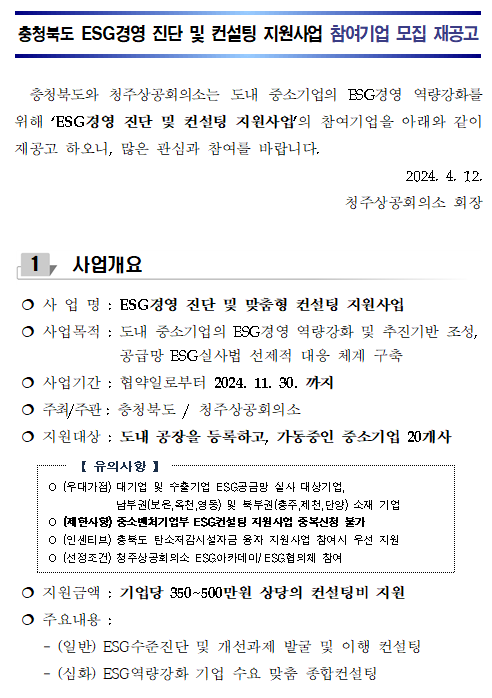 | 충청북도 ESG경영 진단 및 컨설팅 지원사업 참여기업 모집 재공고 | |||||