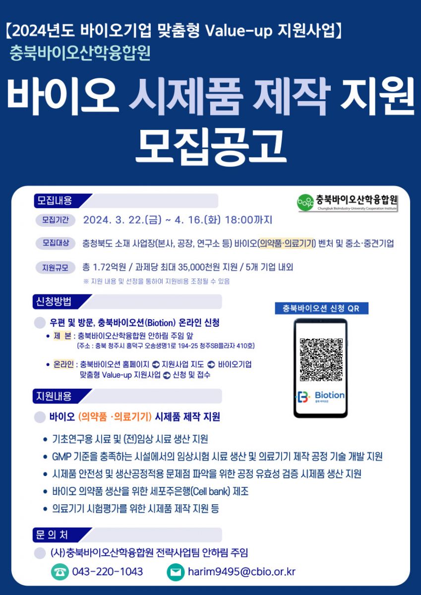 | 2024년 바이오기업 맞춤형 Value-up 지원사업 시제품 제작지원 모집 | |||||