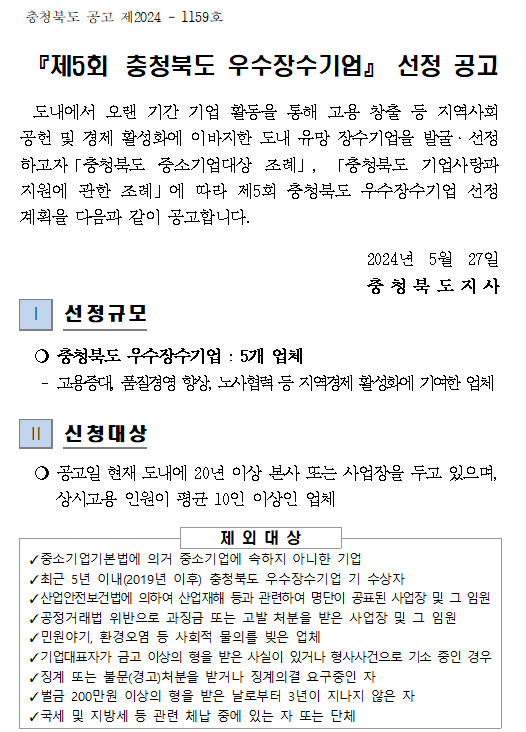 | 2024년 『제5회 충청북도 우수장수기업』 선정 공고문 | |||||
