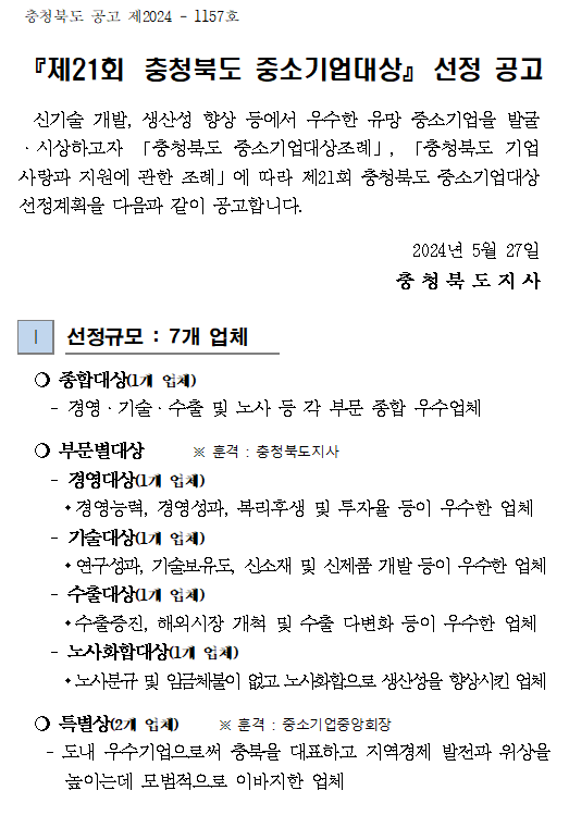 | 2024년 『제21회 충청북도 중소기업대상』 선정 공고문 | |||||
