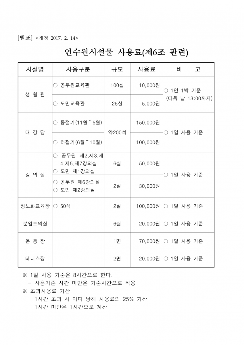 충청북도자치연수원에서는 충청북도 지방공무원 인재양성을 위한 교육 외에도 교육훈련시설(대강당 200석 규모, 강의실)에 대하여 출자·출연기관에 유상(50% 감면)으로 대여하고 있어, 각 기관에서 대규모 교육 또는 행사 주최 시 시설대여가 가능한 점을 안내드립니다.