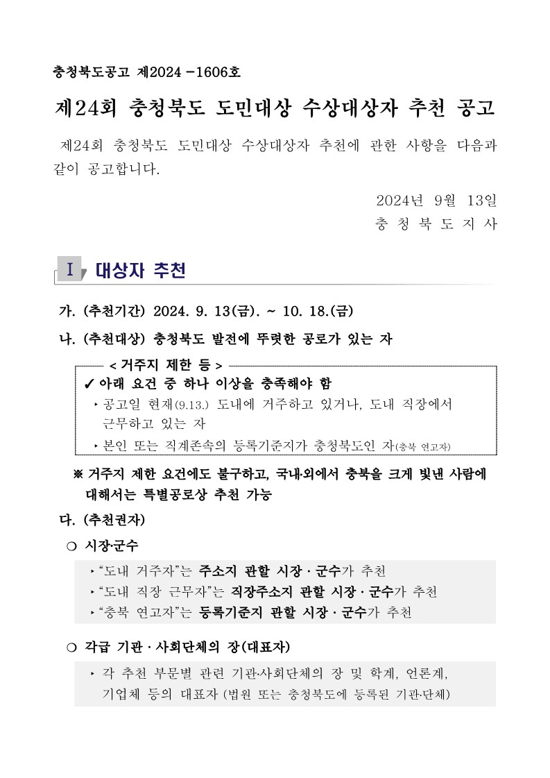 | 제24회 충청북도 도민대상 수상대상자 추천 공고 | |||||