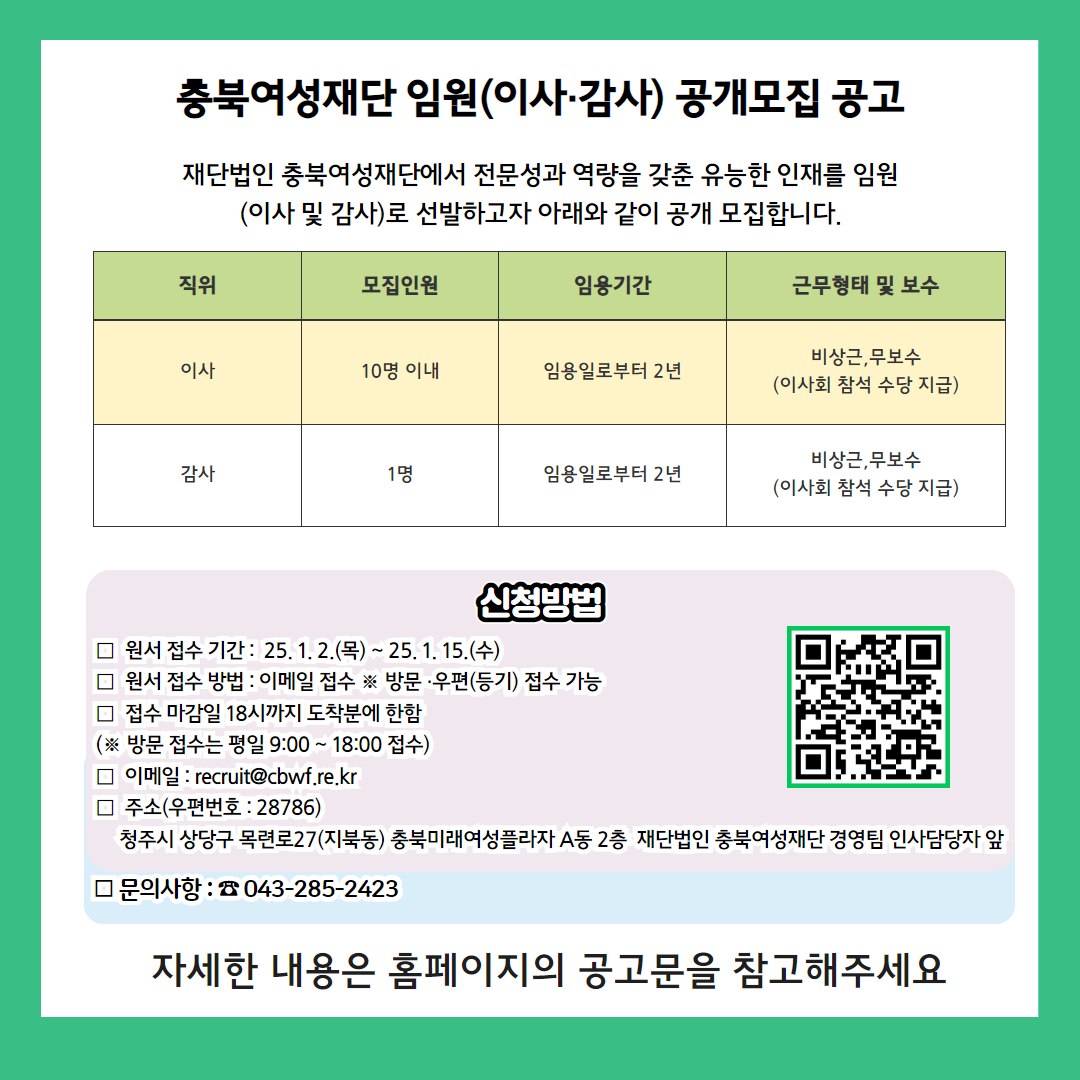 | (재)충북여성재단 임원(이사·감사) 공개모집 공고 | |||||