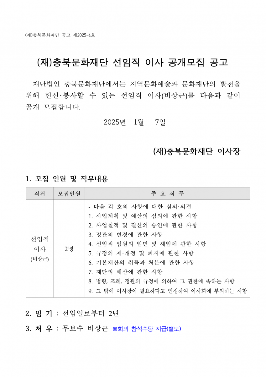 | (재)충북문화재단 선임직 이사 공개모집 공고 | |||||
