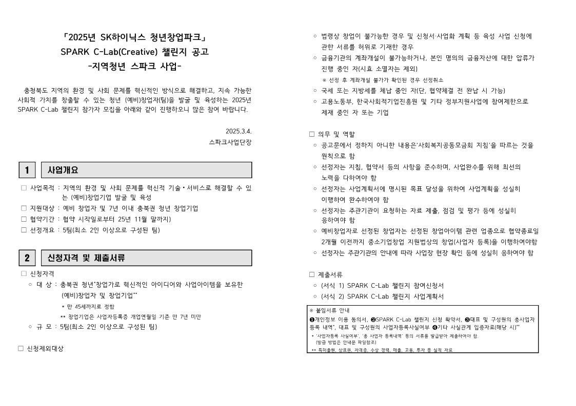 | 2025년도 'SK하이닉스 청년창업파크' SPARK C-Lab 챌린지 공고 | |||||